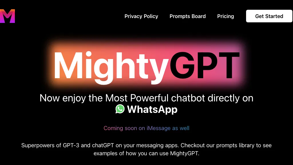 MightyGPT is a chatbot powered by GPT-3 that can be used on WhatsApp, iMessage, and other messaging apps. The tool includes a prompt library for