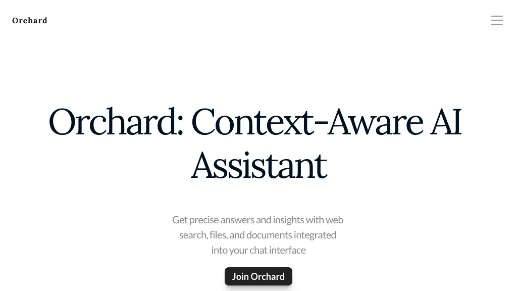 Orchard is a context-aware AI assistant that provides precise answers and insights through a chat interface. It can search web, file, and document integrations, connect