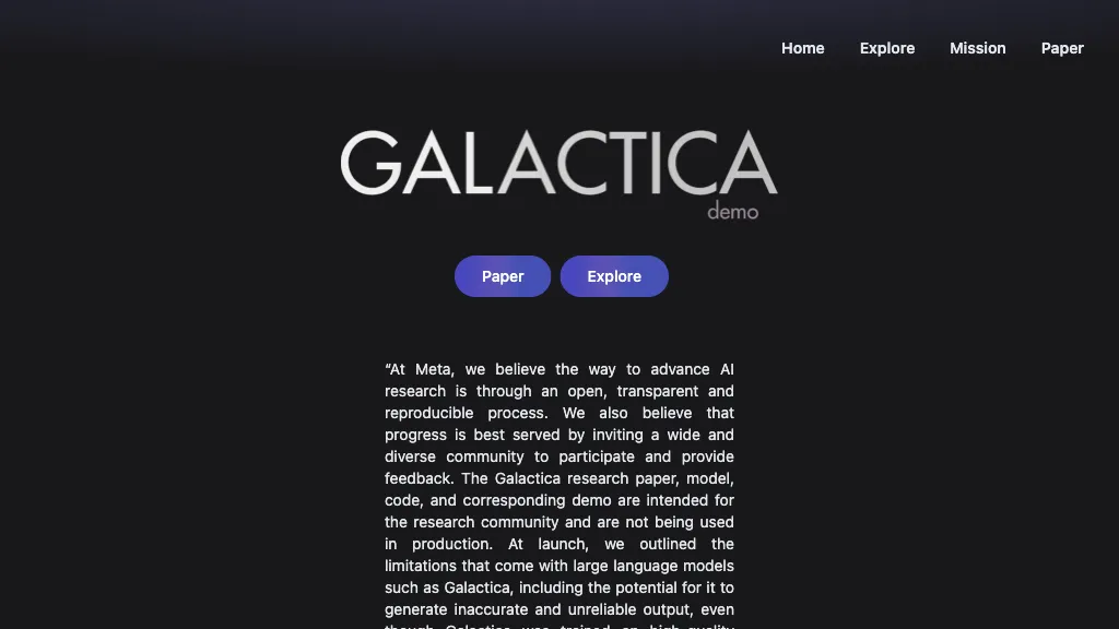 Galactica is an AI tool for advanced research in language modeling. It emphasizes transparency and reproducibility in its processes and welcomes feedback from a diverse