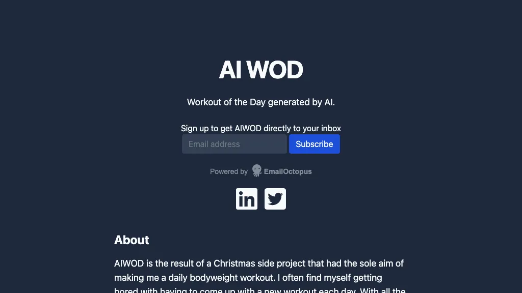 AI Wod is a tool that generates daily bodyweight workouts using GPT-3 technology. Users can sign up for free and receive workout prompts directly to