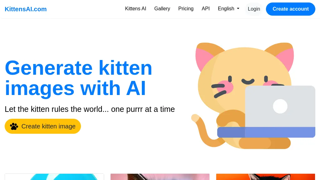 The AI tool generates kitten images with various scenes and settings. It is available in multiple languages and offers an API.