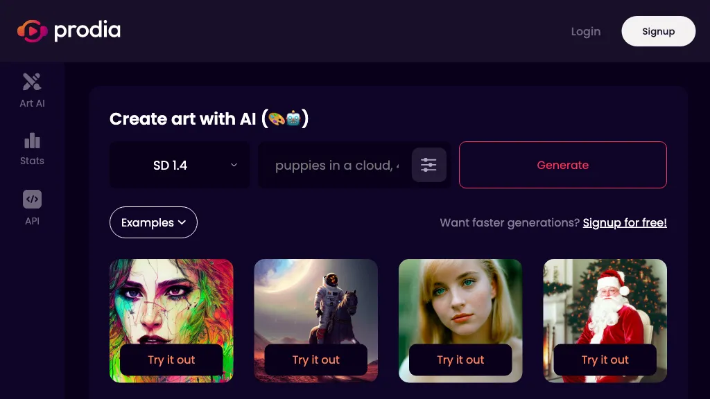 Prodia is an AI tool for generating art and music. It has various options such as aistatsapicr, ai, sd 1.4, anything v3, anything v4.5, analog