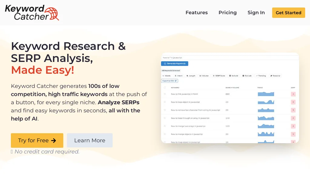 Keyword Catcher is a keyword research and SERP analysis tool that helps users find low competition, high traffic keywords in any niche.It generates hundreds of