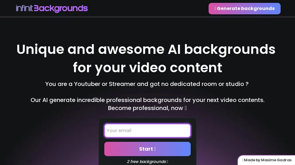 Infinit backgrounds is an AI tool that allows users to generate unique and professional backgrounds for video content. It is specifically targeted towards YouTubers and