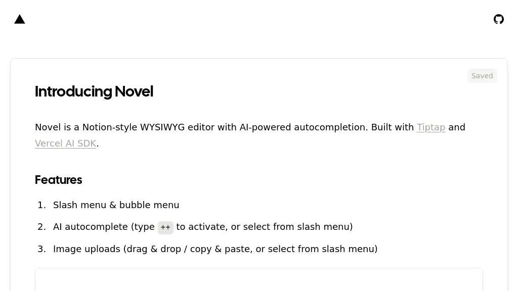 The AI tool is a novel Notion-style WYSIWYG editor with AI-powered autocompletions. It is built using Tiptap and Vercel AI...