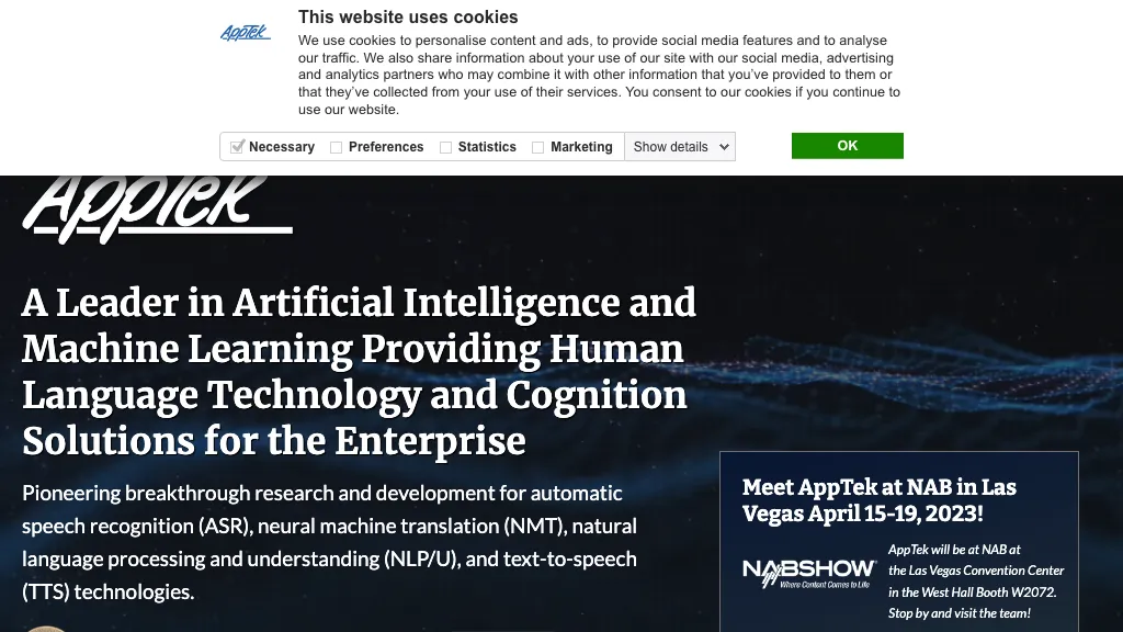 Apptek is an AI language technology solution that provides speech-to-text, enterprise translation, automatic dubbing, media intelligence, and subtitle editing. The...