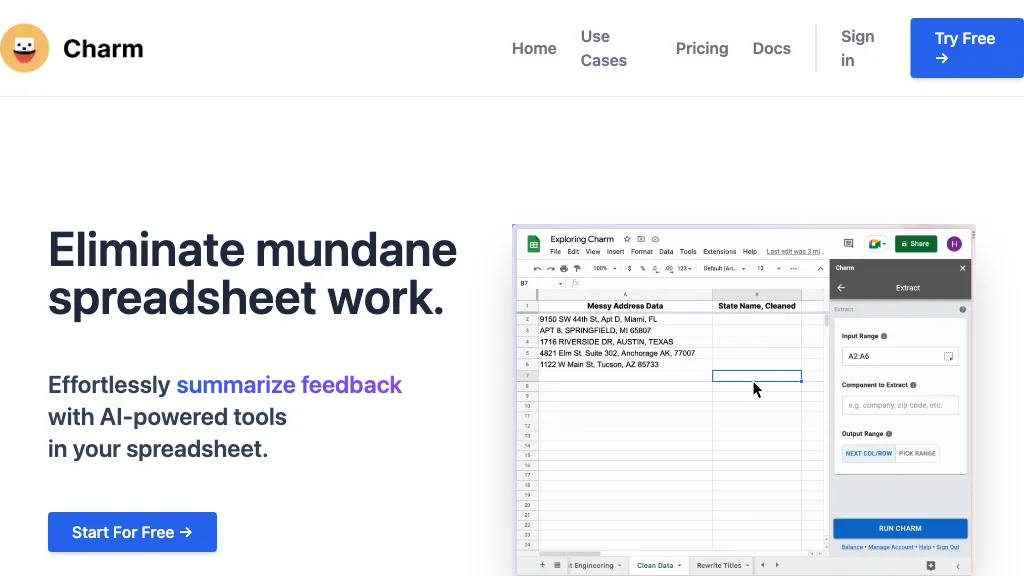 Charm is an AI spreadsheet assistant that helps users create, transform, and analyze text data in Google Sheets. It can...