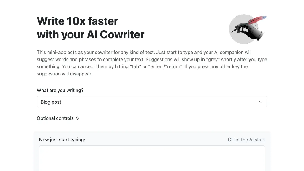 AI Cowrit is a mini-app that can help you write 10 times faster by suggesting words and phrases as you...