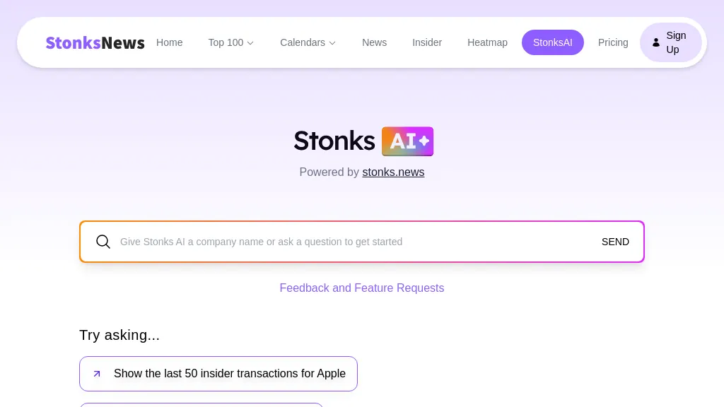 Stonks News allows users to search for news related to top 100 stocks, insider transactions, and popular stocks on Reddit....